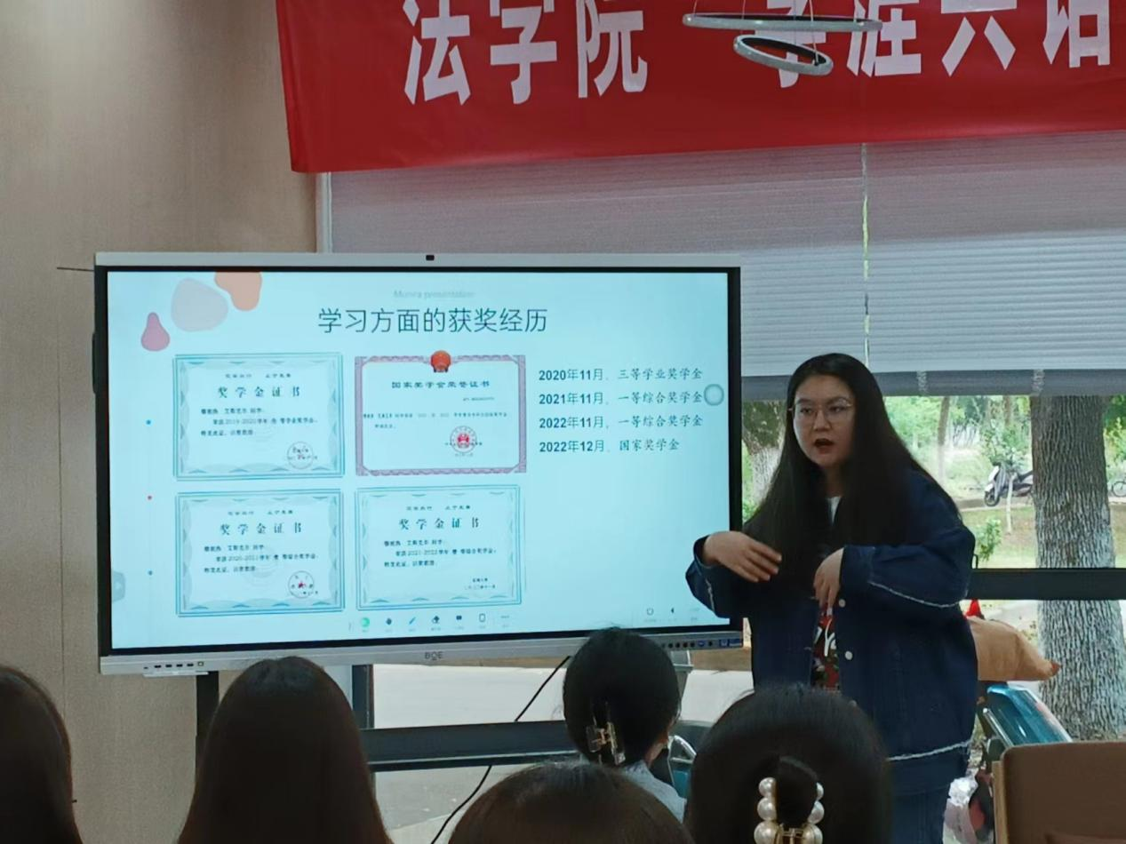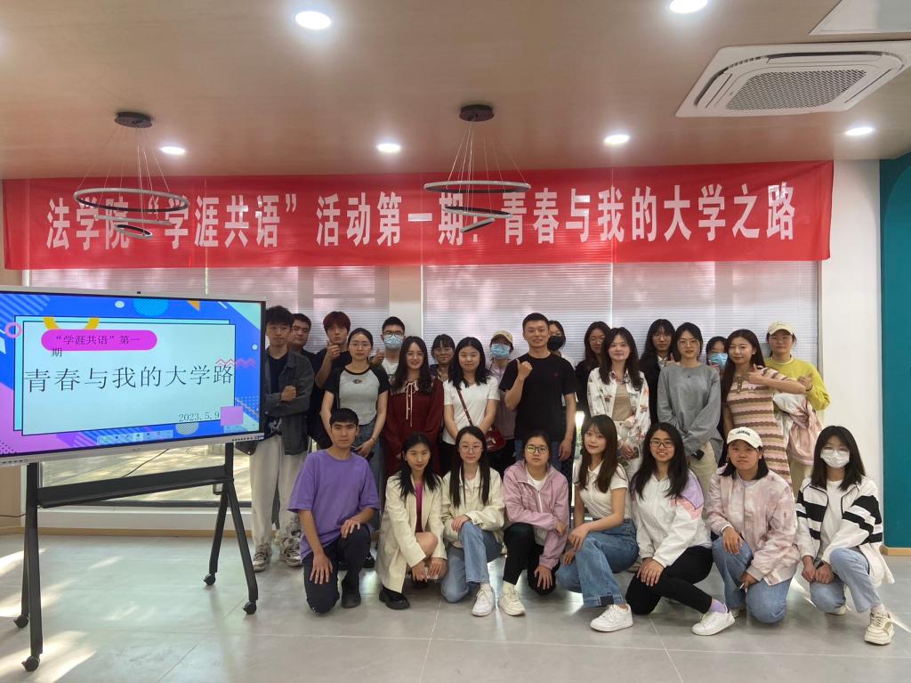 为进一步增强大学生生涯规划意识,引导大学生树立正确的就业观、成才观、价值观,法学院于5月9日、5月10日下午在浩苑学生一站式社区分别举办了“学涯共语”第一期活动。优秀法学专业毕业生代表王一禾、龙腾、卢紫嫣、詹志杰,社工专业毕业生代表李京玉、穆妮热·艾斯克尔、张宁纳、孙叶以及70余名同学参加了本次活动,活动由杨丽晗、李甜甜主持。