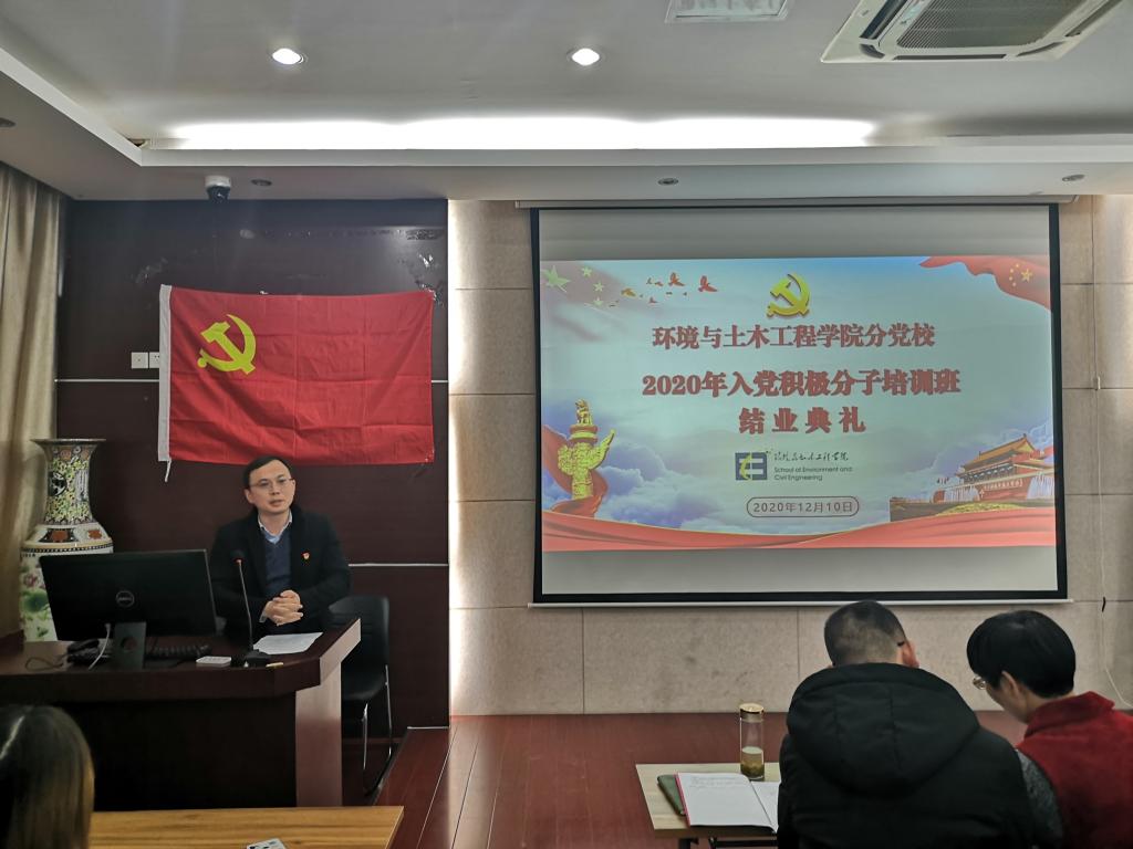 12月10日,环境与土木工程学院分党校2020年学生入党积极分子培训班结业典礼在学院楼D303会议室举行。院党委秘书沈炎,院分团委书记、学工办主任蒋达锋,班主任何涛,辅导员薛羚伟出席了本次结业典礼。