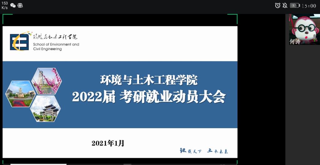 为提高2018级学生大学生涯规划意识,1月29日下午,在前期汇总每位同学考研与就业意向的基础上,江南大学环境与土木工程学院利用线上平台召开2022届毕业生考研就业动员大会暨“知行合一”系列讲座第5讲——考研OR就业那些事儿,帮助同学们尽快明确未来规划。本次讲座由学院分团委书记周佳赟主持,土木工程专业辅导员何涛主讲,2018级全体本科生参与。