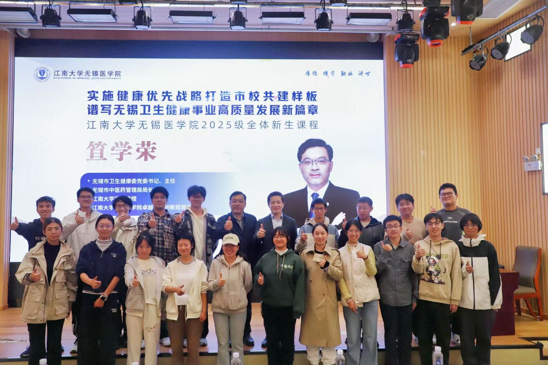 深耕市校共建沃土,共育卓越医学良才。11月11日下午,无锡市卫生健康委员会党委书记、主任笪学荣应邀做客医学院“杏林春暖”大讲堂,为2025级全体本科新生作题为“实施健康优先战略 打造市校共建样板 谱写无锡卫生健康事业高质量发展新篇章”的专题报告。江南大学党委常委、副校长、无锡医学院院长马鑫,无锡医学院党委书记向琪,无锡医学院执行院长孙宁,副院长代卉,2025级全体本科生参加专题报告会,报告会由无锡医学院党委副书记、副院长包羽主持。