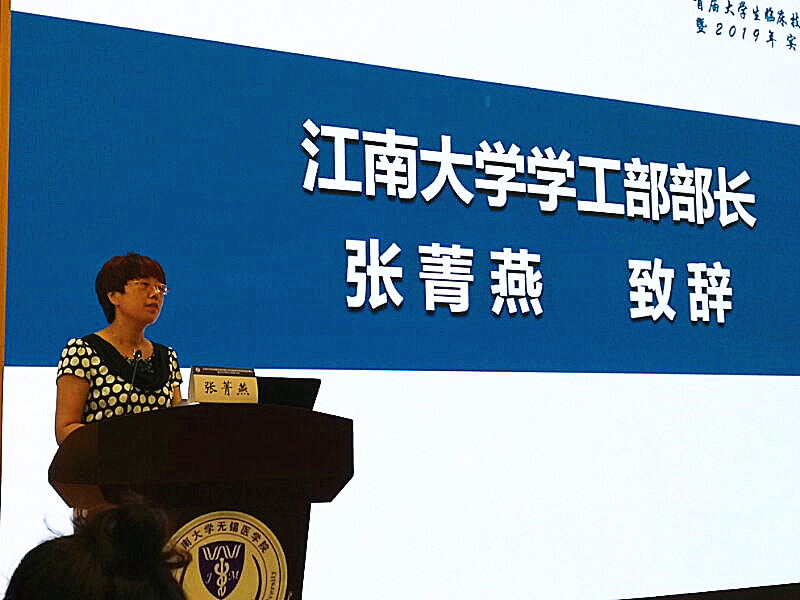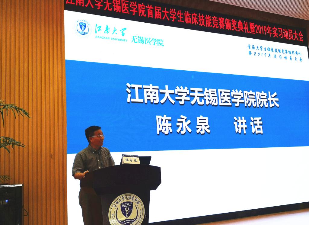 6月17日下午,医学院首届大学生临床技能竞赛颁奖典礼暨2019年实习动员大会在医学院C101举行。江南大学学生工作部部长张菁燕、医学院党委书记周建、院长陈永泉、附属医院党委书记周小金、医学院党委副书记奚晓岚、副院长赵鹏、附属医院副院长祝黎洁、教育处负责人王建中、董文霞、护理部副主任赵杰出席大会。大会由医学院党委副书记奚晓岚主持,附属医院实习带教教师代表以及2014级、2015级临床医学专业和2016级护理学专业全体学生参加了此次大会。