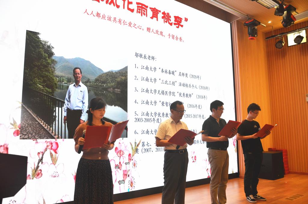 有一种缘分,那就是昔日的师生,今日的同事。邬敏辰、邓超、林丹、王少和都是江南大学无锡医学院的教师。他们师徒四代,一代代接过教书接力棒。“教师”二字对于他们四人来说不仅仅是一份职业,更是一种教书育人精神的传承。在教师节庆祝大会上,师徒四代的邬敏辰、邓超、林丹、王少和老师表演诗朗诵《长大后我就成了你》,深情演绎博爱、仁心和传承的精神,将立德树人奋进担当的理念表达得淋漓尽致。