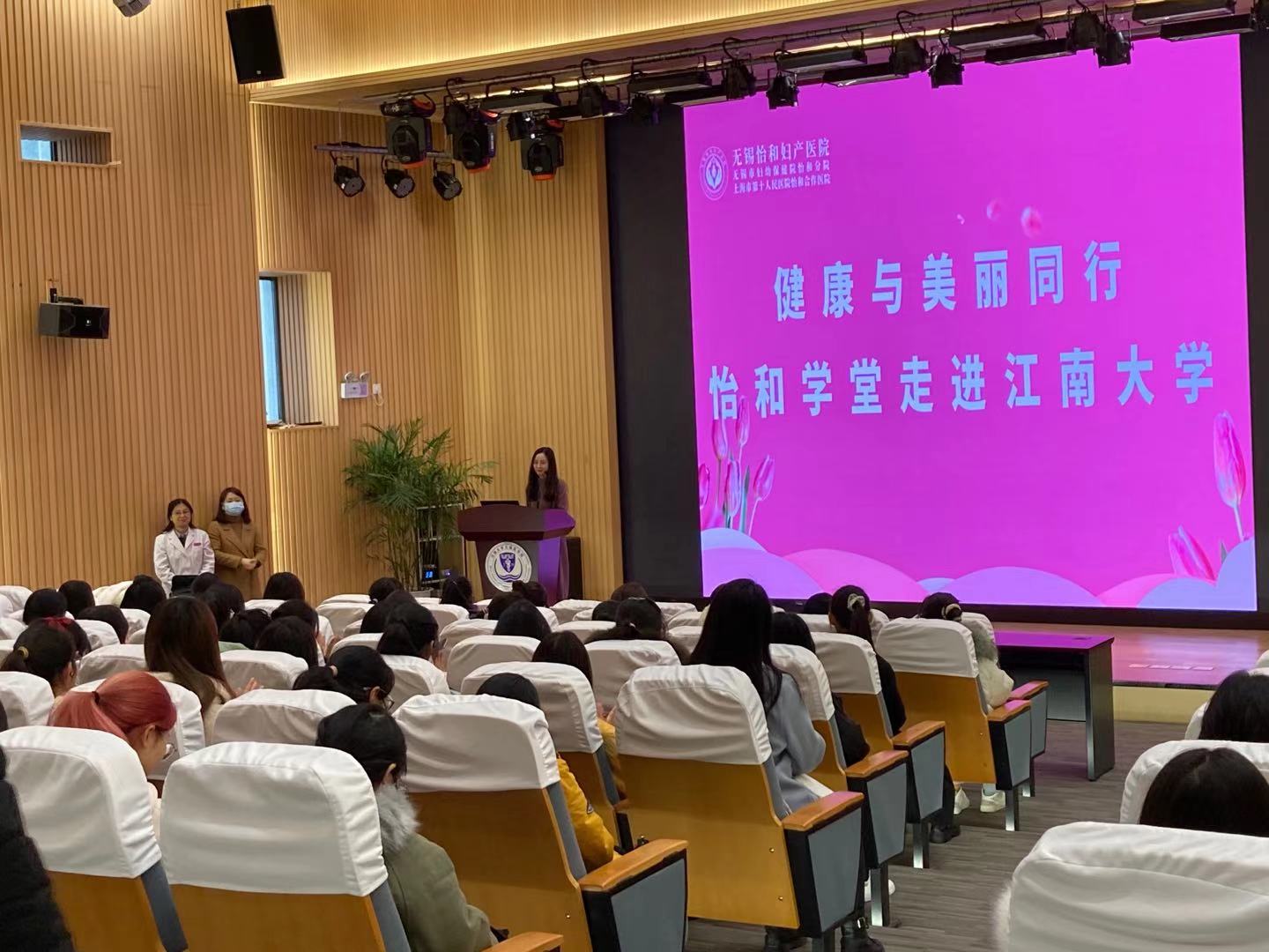 12月9日下午,医学院于C101报告厅开展了医学科普讲堂“美丽与健康同行”暨怡和学堂走进江南大学公益讲堂活动。此次活动由无锡市怡和妇产医院主办、江南大学无锡医学院协办。无锡怡和妇产医院妇产科副主任医师谢彦、计划生育主治医师过燕芳两位老师应邀作为讲课嘉宾,为到场学生带来了一堂关于女大学生美丽健康的公益讲课,来自江南大学各个学院的近200名女大学生积极参加。