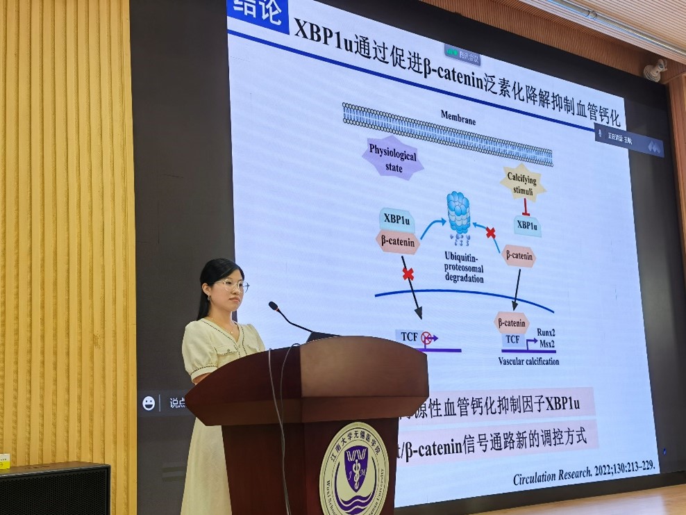 随后,主讲人杨柳开始了主题为《非剪接型XBP1通过促进β-catenin降解抑制血管钙化》学术演讲,生动形象的展示了杨柳老师在北京大学读博期间做的研究,分享了相关工作。汇报结束后,马鑫首先提出问题与主讲人进行深入交流;随后,一些教师和2022级博士刘良举先后提出问题并与主讲人进行深入交流,提问人与主讲人均表示通过交流学到了很多知识,拓展了新的研究思路,解决了一些科研难题。会后几位研一新生与主讲人进行了深入探讨,几位同学均表示对主讲人的研究领域感兴趣,希望深入了解。