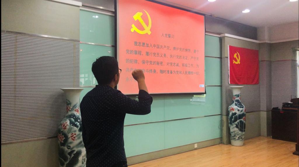 在支部书记陈裕同志的带领下,毕业生党员全体起立,面对鲜红的党旗,举起右手、握紧拳头,庄严宣誓。毕业生重温入党誓词,表达了对坚定政治信念和时刻不忘初心、矢志永远奋斗的坚定决心。