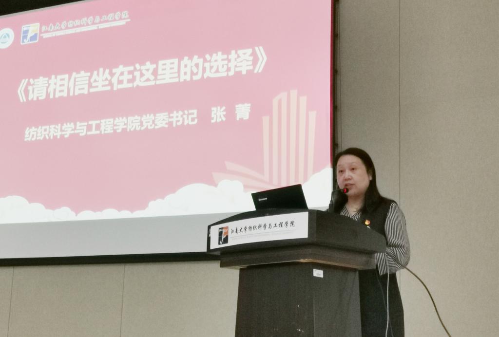 张菁致欢迎辞,她首先代表学院全体师生对284名新同学加入纺院大家庭表示欢迎。她就如何在大学阶段最大可能地去实现人生价值,彰显生命意义,给同学们提出了三点建议:第一、装一份“心怀家国”的胸襟情怀。只有把个人抱负融入伟大事业,人生才会开启一个新的高度,也才能更有条件完成人生价值的进阶;第二、养一种“久久为功”的平和心态。希望同学们做久久为功的努力,从现在做起、小事做起、细节做起,踏踏实实的你,终将变得了不起;第三、定一个“相信未来”的人生目标。每个人都是自己人生的导演,是精彩绚烂还是平凡黯淡,全看你怎么选择,请相信坐在这里的选择,相信未来,只要方向足够明确,信念足够坚定,全世界都会为你让路。