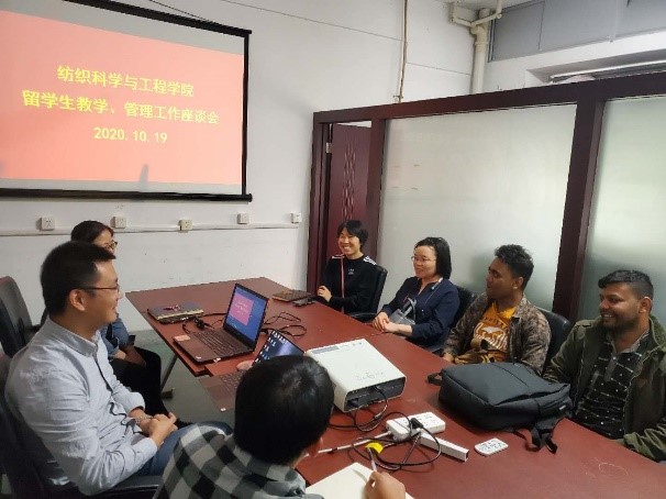10月19日,纺织科学与工程学院的留学生教学、管理工作座谈会在纺织学院举行。纺织学院副院长黄锋林、刘庆生,纺织工程系系主任傅佳佳,留学生班主任柯莹、徐荷澜、崔鹏,以及在校留学生代表卡萨那和萨拉查参加了座谈会。