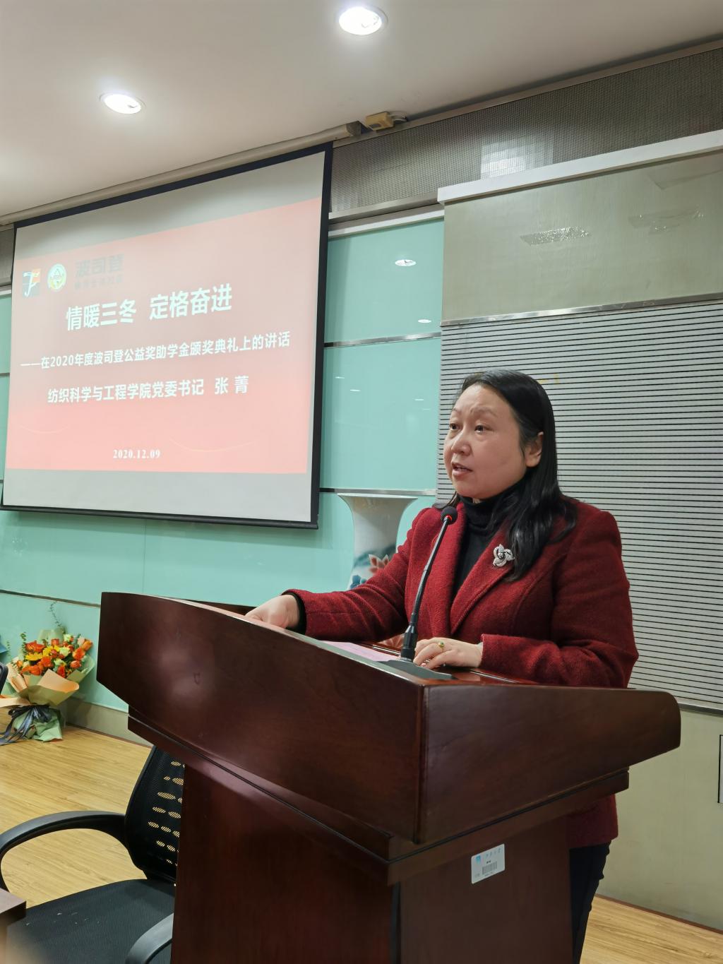 陈艳君首先宣读颁奖决定。根据相关文件规定,经学生本人申请、学院初评、评审委员会审核的工作程序,评选出纺织科学与工程学院黄婕妤等56名同学、设计学院服装专业李莉等26名同学获得2020年度“波司登公益奖助学金”。