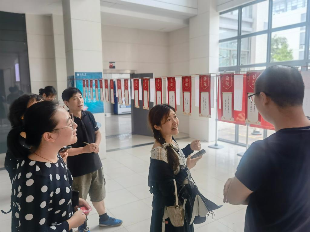 “艰险当头,首先得干(打一党史人物)”“革命火种(打一节日)”“晴天为何打伞(打一党史事件)”……百年党史的光辉历程和党史党情化作一道道趣味十足的谜语。在现场,大家三五成群,热情高涨,或苦思冥想,或脑洞大开,猜出谜底后喜笑颜开,得知谜底后恍然大悟,答案有争议时相互探寻,现场每个人脸上都洋溢着开心的笑容。在轻松愉悦的氛围中,一个个历史事件、一位位历史人物印入了脑海,刻在了心中,润物无声地加深了广大教师对党的十九大精神、党规党纪、党史知识的理解和认识,助推党史学习入脑入心。短短2个小时,50余条谜语被大家一一竞猜得到谜底。