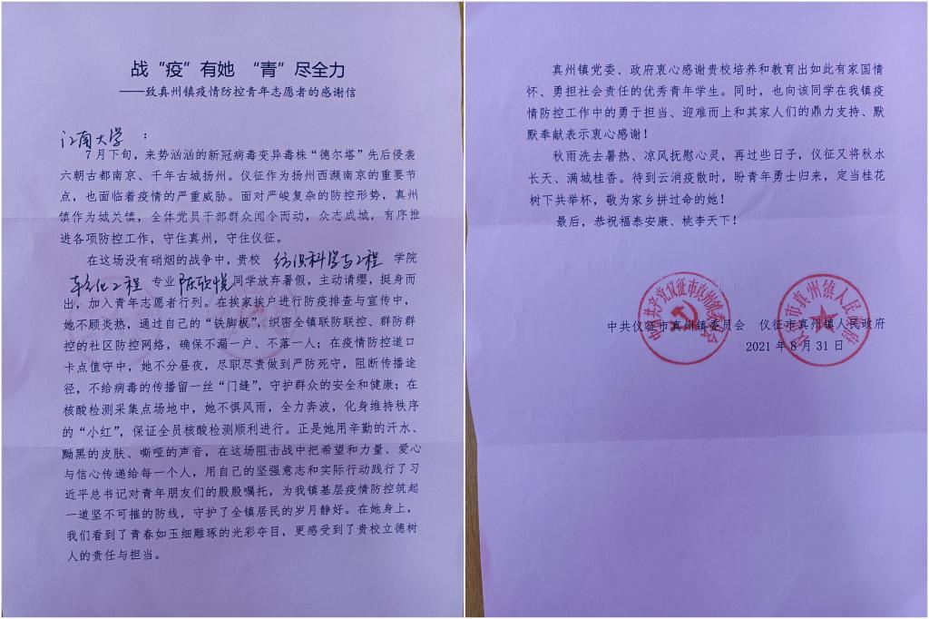近日,学校收到一封感谢信,中共仪征市真州镇委员会、仪征市真州镇人民政府在信中表达了对纺织科学与工程学院陈欣悦同学于暑假期间在该地区疫情防控志愿服务中的鼎力支持、默默奉献表示感谢,同时对学校培养和教育出如此有家国情怀、勇担社会责任的优秀青年学生给予高度评价。