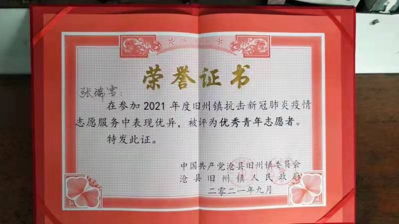 张瑞雪同学受表彰