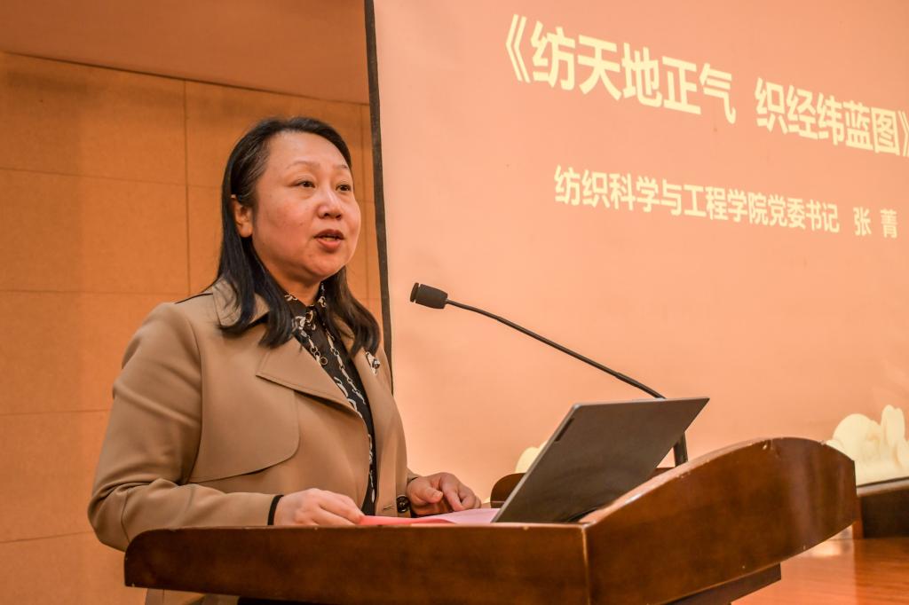 张菁代表学院全体师生对290名新同学加入纺院大家庭表示欢迎。张菁就如何在大学阶段最大可能地去实现人生价值给同学们提出了三点建议:第一,砥砺“位卑未敢忘忧国”的家国情怀,坚定理想信念,树立高远志向,厚植爱国情怀;第二,磨炼“咬定青山不放松”的处世定力,保持定力、严格自律,抵得住诱惑,耐得住寂寞,在人生的康庄大道上矢志不渝、奋发有为;第三,践行“俯首甘为孺子牛”的初心使命,接过历史的接力棒,承前启后,继往开来,初心不改,虽远不怠。