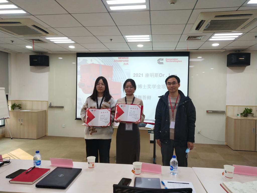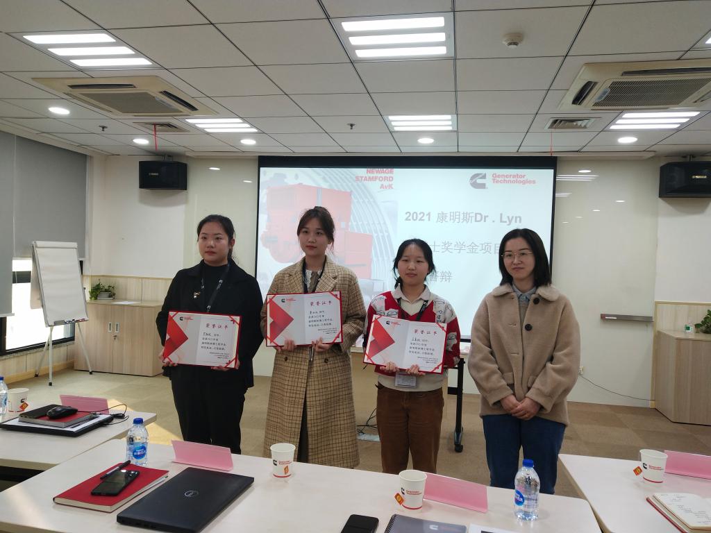 随后,六个小组依次上台答辩,同学们思维活跃、想法大胆、逻辑缜密、表达流利,与在场的评委们不断碰撞出火花,赢得阵阵掌声和不断好评。最终,经过评审,夏斯璇、孟卓、吕青、吴菁柯、林丽英、常冰冰、罗凯迪、龚晓硕、邱轩9名同学获得2021-2022学年度“康明斯林慰梓博士奖学金”,康明斯发电机技术(中国)有限公司工厂ME经理刘锋,ME经理沈娆洁和CR主席陈倩云分别为三组同学颁奖。
