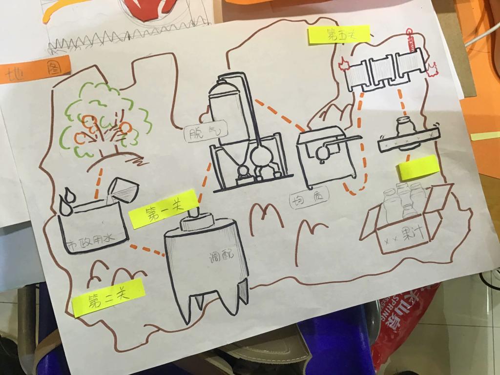 工作坊期间,同学们从食品生产这个主题入手,旨在设计出帮助食品专业的学生在玩游戏中学到知识的严肃游戏原型。在工作坊正式开始之前,同学参加了六次小型研讨会提前熟悉严肃游戏和食品生产基础知识并锻炼了英语口语能力和小组合作能力。工作坊的学习一共分为三个阶段:严肃游戏的概念学习、纸质原型的设计、数字原型开发。第一阶段,教授们展示了一个非常基本的游戏Tic-Tac-Toe,学生在改进游戏的设计的过程中理解游戏设计中MDA(Mechanics,Dynaics,Aesthetics)模型的功用。第二阶段,结合食品生产线展开头脑风暴,学生们选择最佳的游戏方案迭代开发纸质原型。第三阶段,艺术同学用PS游戏场景和角色,技术同学用UNITY编写代码实现游戏功能,共同开发数字原型。同学们发挥各自的专业特长,设计游戏,绘制图形界面,编写程序,亲身参与游戏设计和开发的全过程。