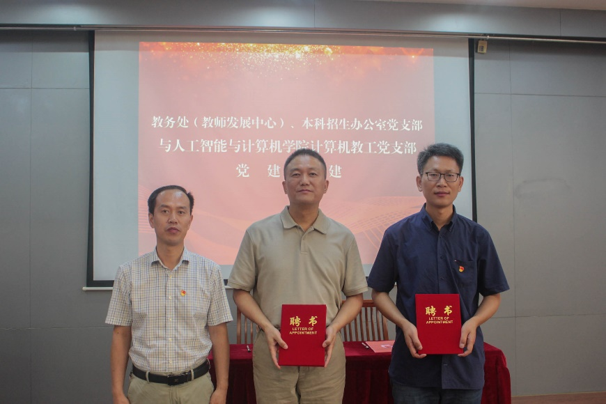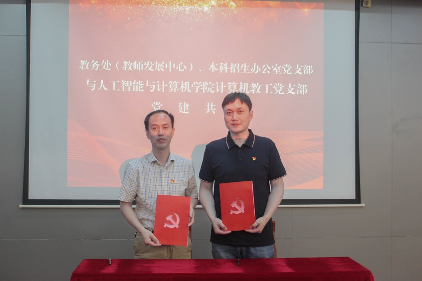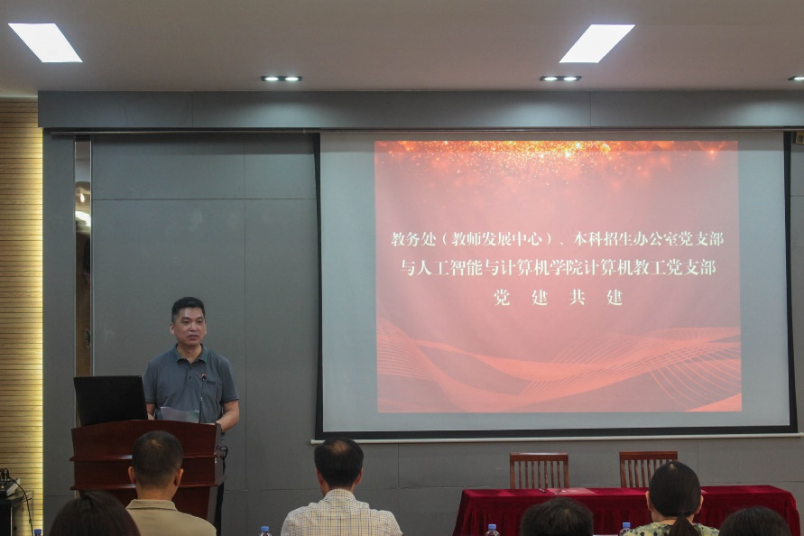 7月5日下午,人工智能与计算机学院计算机教工党支部与教务处(教师发展中心)、本科招生办公室党支部在人工智能与计算机学院B310会议室开展支部共建。人工智能与计算机学院党委书记张华,副院长(主持工作)方伟,教务处副处长吴宝锁,人工智能与计算机学院副院长、计算机教工党支部书记宋威,教务处(教师发展中心)、本科招生办公室党支部副书记聂晨曦,以及两个党支部的全体党员参加了此次活动。