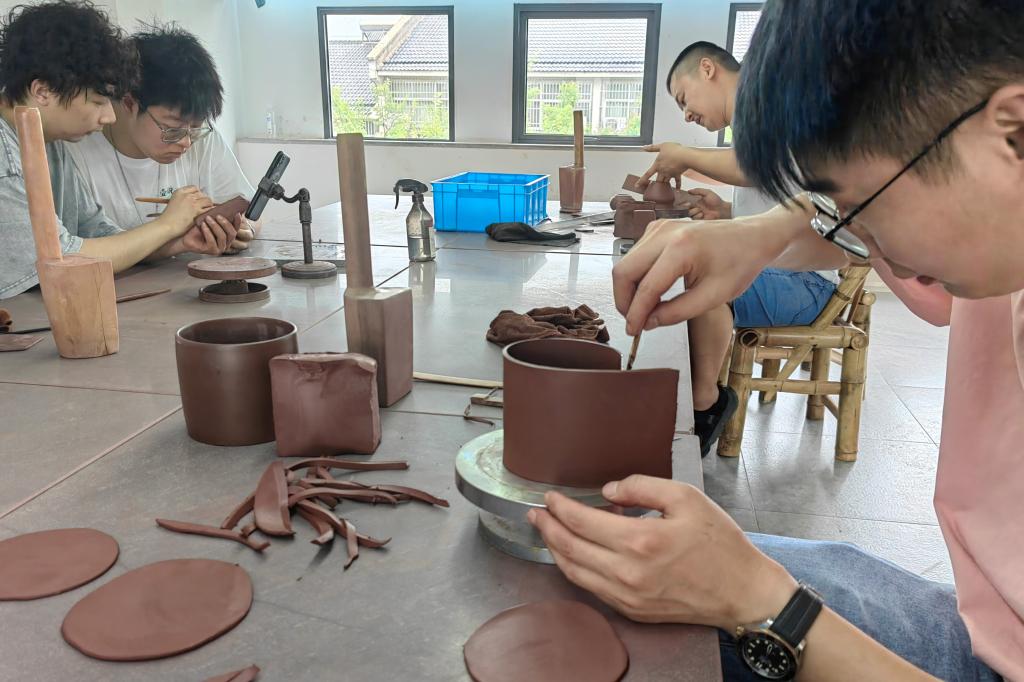 西望村位于太湖西岸,是著名的紫砂壶制作生产聚集区,以“人人会制壶,家家都弄陶”闻名于世。团队成员参观了丁蜀镇综合文化服务中心和中国宜兴陶瓷博物馆,了解博物馆的建馆历程、发展优势和文化意蕴,深刻了解宜兴紫砂产业现状和发展愿景。团队成员走访了该村党总支书记、村委会主任范泽锋,了解了西望村如何将合作社模式运用到手工业中,通过“合作社+领头人+村民”模式,完成从“守着金饭碗吃不饱肚皮”到实现人均年收入近十万元的转变。西望村还积极探寻与各大高校合作,在为大学生提供实践创新平台同时,吸引年轻人才进入紫砂行业,以新型人才助力乡村振兴、文化振兴。调研过程中,团队成员向当地居民提出了运用微信小程序促进紫砂壶售卖的想法,努力运用专业知识帮助村民。同学们还走访了范家壶庄和范泽锋劳模创新工作室,采访了范伟群大师,了解范家壶庄的创意理念和发展规划。在范泽锋劳模创新工作室,四位师傅带领大学生深入了解紫砂壶的制作过程,指导同学们亲手制作紫砂杯。
