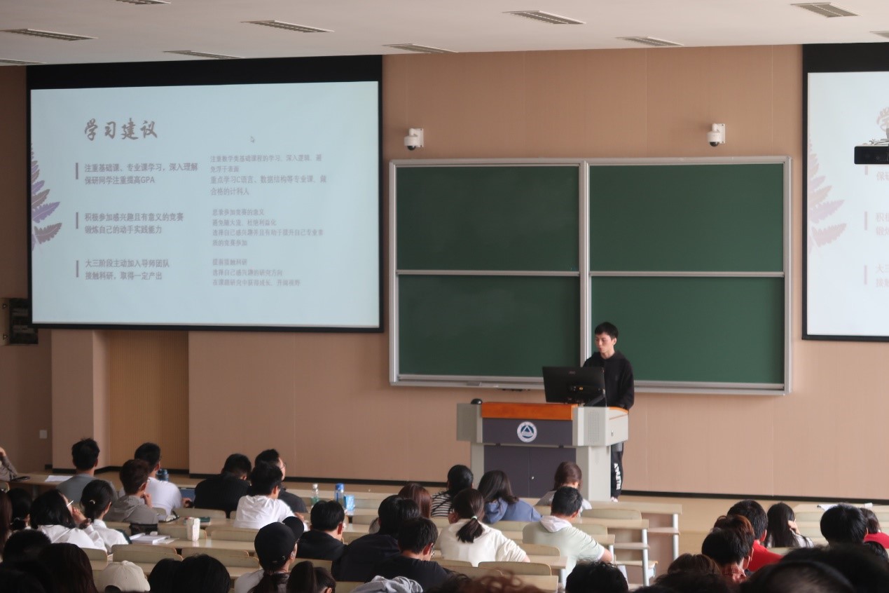 马佳芮同学从“学习是第一要务”“科创是锦上添花”“跨专业保研设计”三个方面进行了学习经验分享。鼓励学弟学妹们大一期间打好知识基础,在学期间积极参加科研竞赛,多看、多练、多学习,不断充实自我,不断成为更好的人。