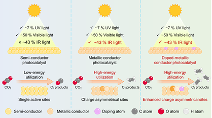 具有电荷不对称双活性位点的导体催化剂上红外光催化CO2还原制C2产物的示意图