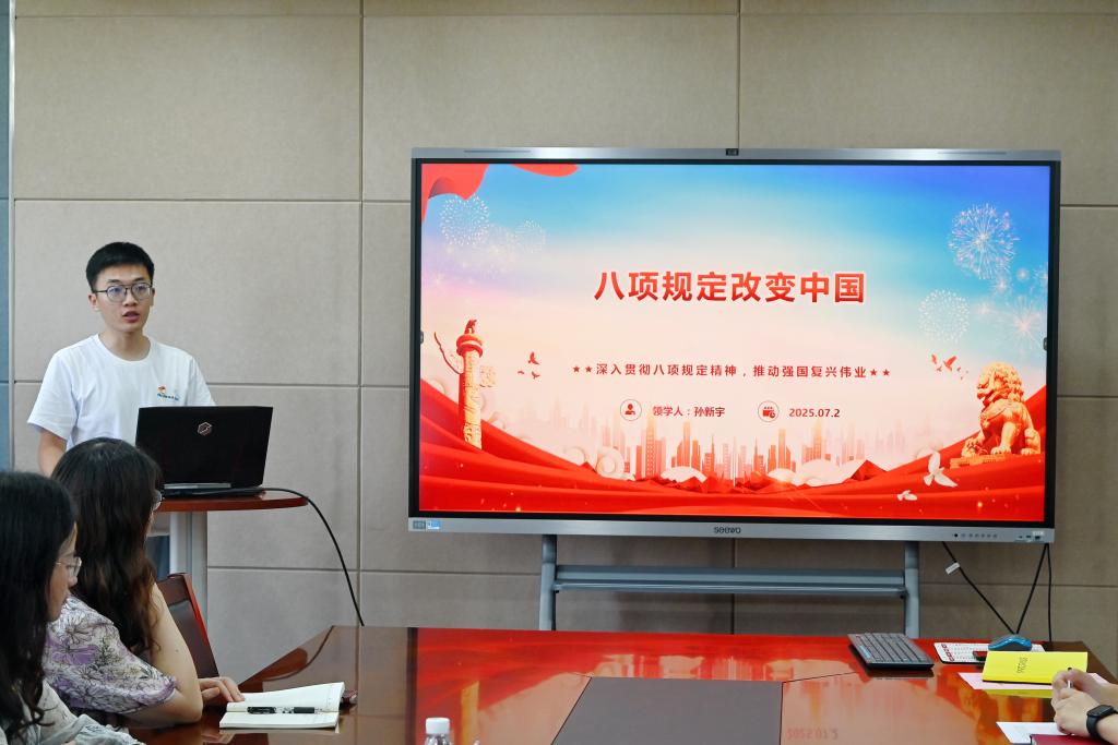 党支部纪检委员孙新宇同志以《八项规定改变中国:深入贯彻中央八项规定精神,推动强国复兴伟业》为题进行领学。从井冈山时期毛主席定下的“一根灯芯”规矩,到社会主义革命和建设时期提出的“六条规定”,再到中国特色社会主义新时代习近平总书记主持通过的中央八项规定,深入阐述了党风建设的历史脉络与现实意义,展现了中国共产党百年来一以贯之的作风建设决心。他还结合典型案例,阐释了中央八项规定及其实施细则精神,以案说纪、以案说法、以案说责,引导支部党员意识到深入贯彻中央八项规定精神不仅是党员干部的政治任务,更是青年党员坚定理想信念、提升思想自觉的重要路径。随后,全体党员共同观看了专题视频《八项规定改变中国:党在新时代的徙木立信之举》,进一步增强了大家对中央八项规定精神的理解和认识。