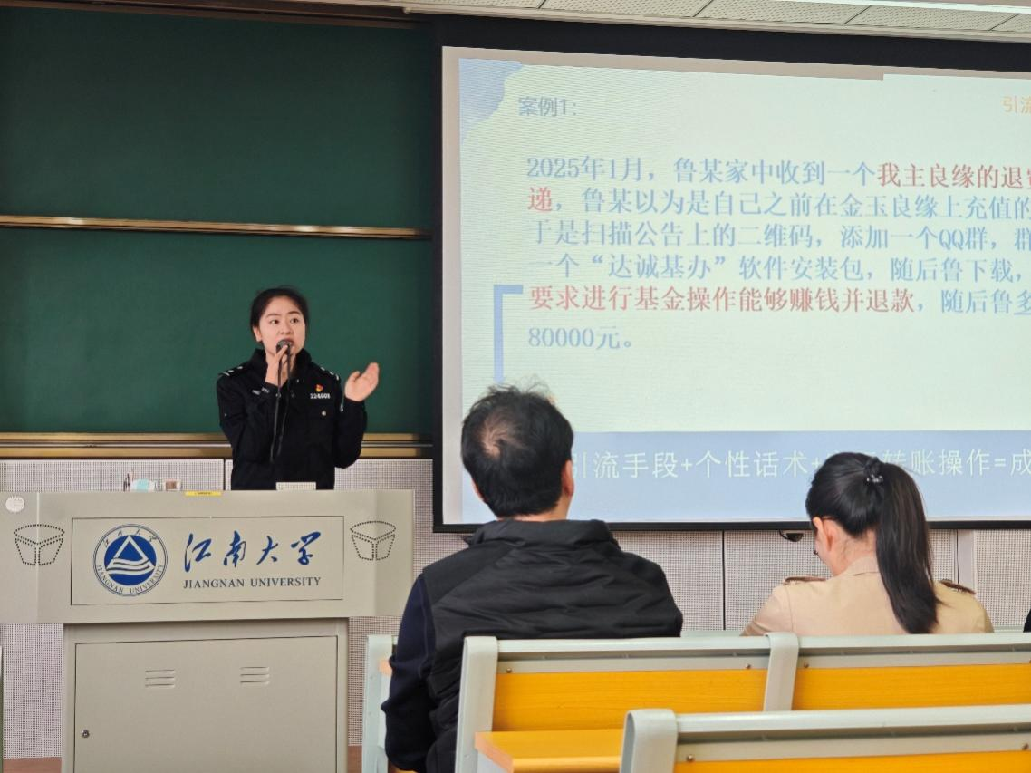 为切实强化2025级硕士研究生的安全防范意识与应急处置能力,筑牢校园安全防线,助力新生顺利开启科研与学习生活,11月11日上午,江南大学化学与材料工程学院在东氿校区知行楼举办“守好安全‘第一关’,共筑科研‘防火墙’”新生安全讲座暨消防模拟演练活动。宜兴市公安局反诈宣传警官高璐瑶、学校实验室与资产管理处安全技术科高珂老师、保卫处消防科刘保红老师及化工学院实验室管理张一波老师受邀担任主讲嘉宾。活动由研究生辅导员李晓洁主持。