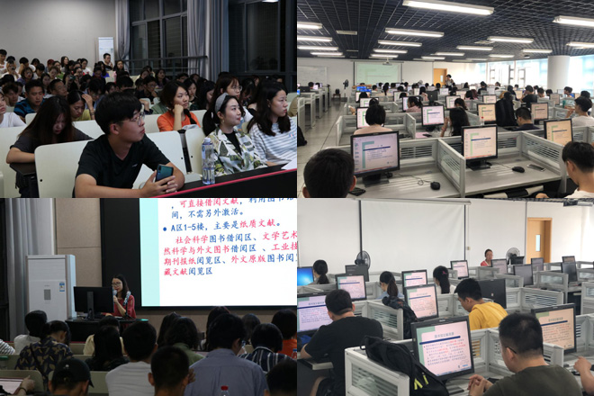 “信息资源海洋任遨游”:A.“笃学讲堂”迎新讲座,为让新生在短时间能了解图书馆,同时增强新生信息素养意识,建立信息素养能力,图书馆特地为新生们安排了一系列全开放的讲座,如“如何快速了解和利用图书馆”、“如何找到自己需要的文献”、“图书馆有哪些电子文献资源”等,以指导学生在大数据时代更好的利用文献信息资源。B.研究生“信息素养第一课”,为使研究生新生更快更好地利用数字化文献信息资源开展选题和课题研究,图书馆学科馆员根据各院系学科特点与信息需求,深入各院系组织了开展“信息素养第一课”讲座,介绍数字文献资源的检索与分析利用。通过此次活动使研究生新生可以前期形成好的学术规划,并与方法论有效的结合起来,为他们以后能更好地脚踏实地走好学术路、撰写优质论文、拓展学术本领给予充分地帮助。