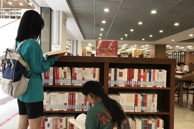 专题书籍展以党史类、军史类,中国特色社会主义理论以及习近平总书记治国理政等主题书籍为特色,集中展出了多语种《中国共产党为什么能》(增订本)、《中国道路——中国经济学家的思考和探索》等书籍共1014种,1661册。同时在歌德电子阅读机上开设网上专栏,提供237册红色书籍的网络下载,方便读者移动阅读。