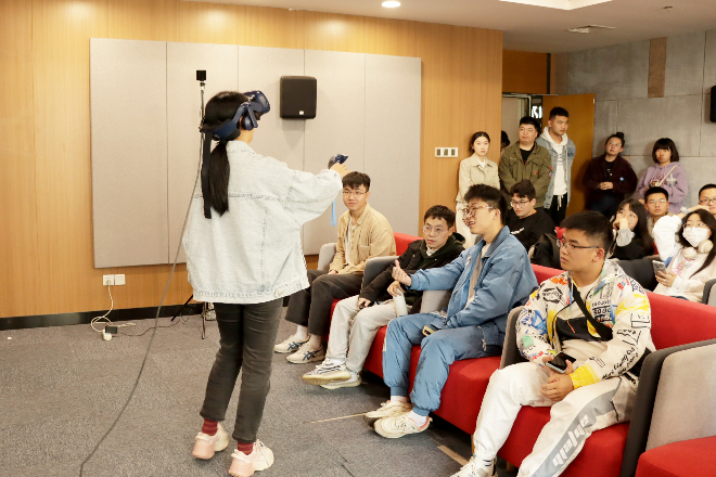 李栋宁围绕数字媒体艺术的哲学思辨、审美特质等重要问题,用幽默风趣的语言向读者展示着数字媒体艺术的魅力。在我们所处的实时更新的讯息、全球化线上社交的新时代里,世界实现了“万事皆数字”“万物皆互联”。数字媒体艺术以其时代之特性、形态之特殊、受众之广泛,成为美育教育的急先锋,寻觅数字媒体艺术审美的真谛显得意义重大。这场探寻审美方式和感知数字媒体艺术学科内核的讲座持续了一个半小时,互动环节中,不少同学们积极提问,现场气氛热烈。讲座结束,现场听众戴上穿戴设备,现场感受数字媒体技术带来的沉浸式的人机交互体验和虚拟与现实交融的乐趣。