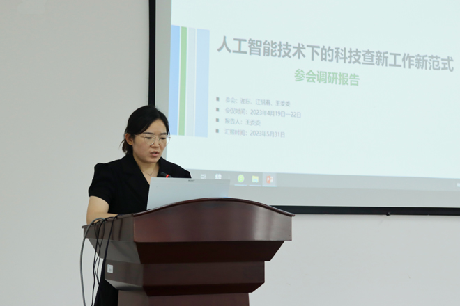 随后,科技查新站王委委就“人工智能技术下的科技查新工作新范式”学术研讨会参会调研情况展开分享,围绕人工智能背景下科技查新工作的新趋势、新发展以及衍生的新工具、新方法,进一步提升科技查新和科技情报分析在科技成果转移转化的作用等主题,分享内容涉及我国科技查新发展现状与未来思考、科技查新元数据标准化框架体系构建、查新机构的技术发展路径、数字化赋能科技查新、科技查新与成果转化研究、科技前沿情报研究等方面,提出当前科技查新仍要作为主要工作,同时针对自身存在的问题,今后应逐步开展智库建设,包括新知识、新技术、新工具、人才梯队建设、团队研究等,不断探索与学习,提高服务效率和服务质量。此外,立足科技查新,发挥自身优势,辐射服务动能,积极参与科技成果深度评价、专利导航等,朝向精细化、专业化服务发展。