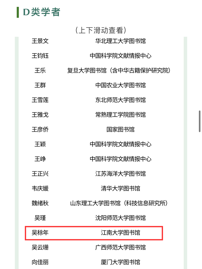 近日,图书馆学术评价课题组联合新文科专委会正式发布了“2023图书馆学术能力排名”和“2023年图书馆学者学术活跃度榜”,排名分别展示了国内各类型图书馆和图书馆学者的学术竞争力水平。江南大学图书馆取得历史佳绩。机构层面,江南大学图书馆位列全国高校图书馆第32名,江苏高校图书馆第4名;学者层面,入选2人,其中顾烨青为A类;吴稌年为D类。顾烨青位列图书馆学者学术活跃度榜单高校图书馆第12名。