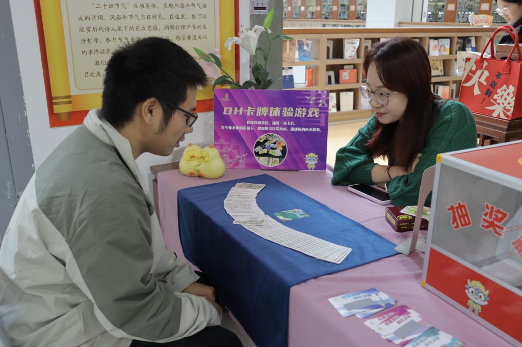随后,一场别开生面的“刮刮卡”寻书阅读活动正式开启。同学们根据兴趣与需求抽取卡片,按照卡片上的书名在“分色分区”书展主题区中找到对应书籍,并在舒适,温馨的阅读区中进行20分钟沉浸式阅读。本次书单由南京大学徐雁教授研究生团队推荐,涵盖“认清自我价值”“寻觅解压出口”“擦去心灵尘埃,疏导压抑苦闷”“排除性别烦恼,追求恋爱幸福”等十个主题共84本纸质图书,以及江南大学书友协会推荐的20册“心灵诗歌”畅销书籍。此外,现场还提供了每本书的封面展示,电子书二维码等,以满足读者多元需求。