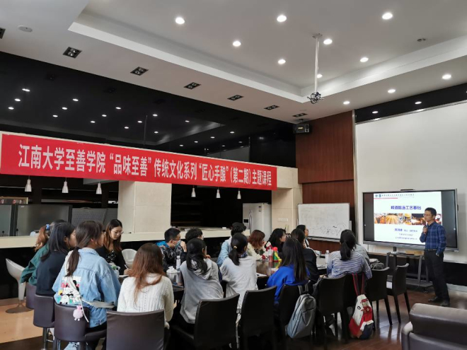 “匠心手酿”主题课程由江南大学粮食发酵工艺与技术国家工程实验室教师姚克明和蔡国林主讲。他们结合啤酒酿造工艺基础、啤酒制造工艺,详细地为大家介绍了酿酒流程及技艺,还结合当前中国啤酒产业发展现状进行分析,使同学们对啤酒工艺以及啤酒品牌形成初步认识。随后,老师将同学们带入实验室,带领同学们品尝近三十种低酒精度数的啤酒,让同学们更加直观地感受由不同酿造工艺所带来的不同品种酒的的味觉盛宴。
