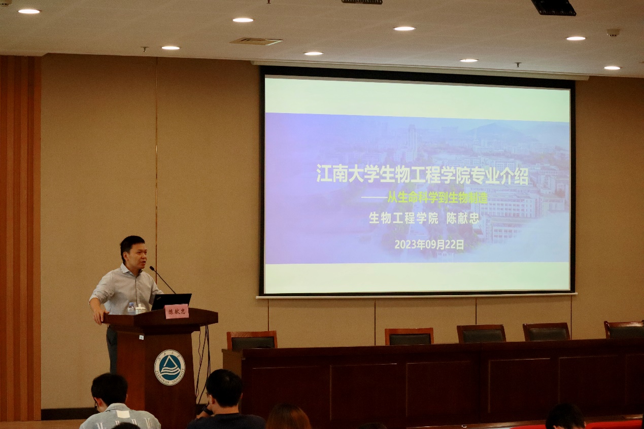 陈献忠向大家介绍了学院在科研平台、科学研究、基地班培养上取得的成就。江南大学生物工程学院是发酵工程师的摇篮,培养了国内最早一批酿酒专业的人才,其中14位校友被评选为全国酿酒大师,为中国酿酒工业做出了杰出的贡献。陈献忠还对生物技术进行介绍,生物技术是以工业生物技术为特色,合成生物学为核心的前沿领域,合理利用可以对人类生活进行巨大改善,生物技术已成为国家战略的必争之地,同时也希望同学们能厚植家国情怀,掌握前沿生物技术,为行业发展做出贡献。