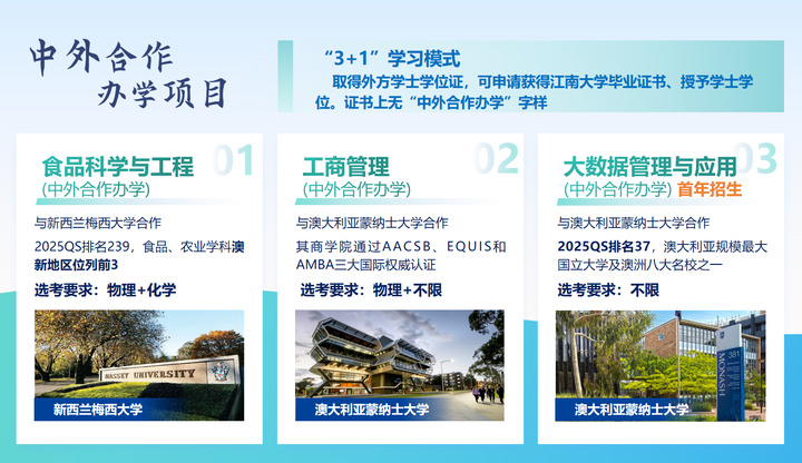 今年,江南大学新增“大数据管理与应用”中外合作办学项目,“3+1”模式,澳大利亚莫纳什大学合作项目,可获得莫纳什大学学士学位,江南大学本科毕业证书和学士学位,无中外合作办学字样。商科与大数据技术融合,引入莫纳什大学在大数据技术和商科教育的优势教育资源,将前沿领域、管理实践、学科交叉、国际视野、高端师资等教学特色融合,旨在满足数字经济时代对大数据领域高素质人才的需求。