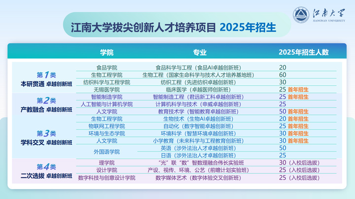 今年,江南大学将开设四大类16个卓越创新班,培养未来行业领军人才。