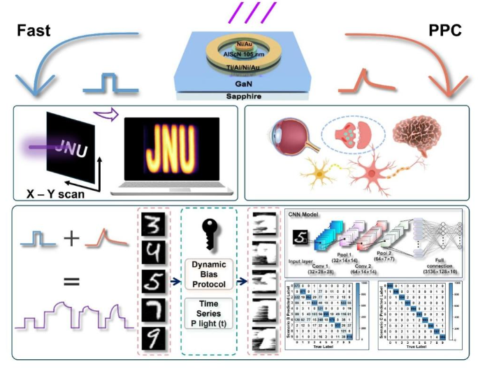 【中国教育报客户端11月11日】日前,记者从江南大学了解到,江南大学理学院杨国锋教授团队在宽禁带半导体多功能光电子器件领域取得重要进展,提出了一种基于偏压调控实现神经形态计算与硬件加密成像的多功能器件方案。该方案具有实现单器件多功能集成、低功耗与高安全性的优势。相关成果日前发表在国际顶级期刊《Advanced Photonics》(《先进光子学》)上。
