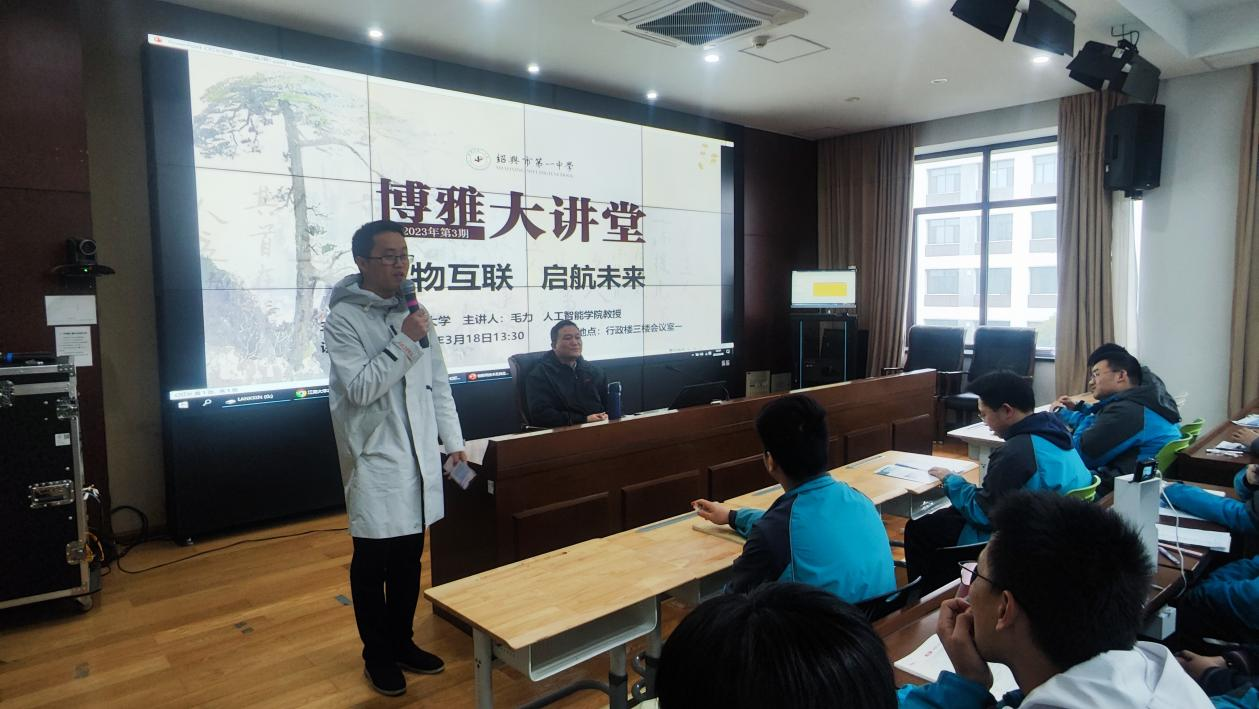 近日,江南大学“百名教授进名校”活动走进浙江省绍兴市第一中学。浙江省招生组、人工智能与计算机学院毛力教授受邀走进“博雅大讲堂”,以“物联网技术与其应用”为主题为学生带来一场精彩绝伦的报告,报告会由绍兴一中党委副书记、纪委书记孙洪亮主持。