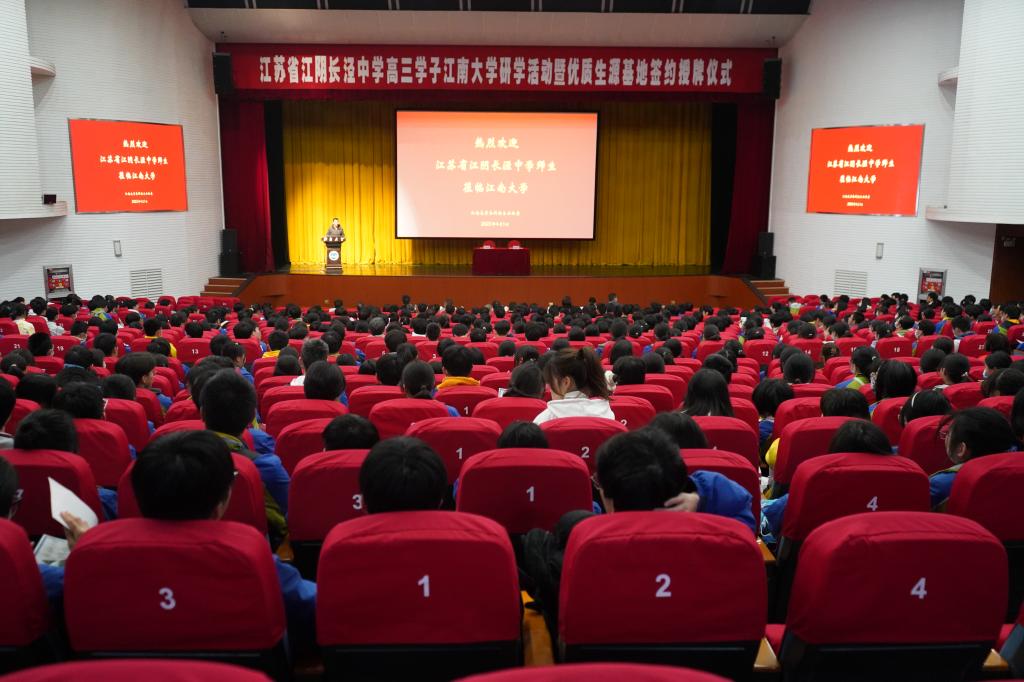 近日,江南大学与江苏省江阴长泾中学“优质生源基地”签约授牌仪式暨“研学江南”活动在学校举行。江南大学教务处处长、本科招生办公室主任李兆丰,本科招生办公室郑真真、吴琰嘉等,江苏省江阴长泾中学党委副书记汪黎明,教务处主任张芝兰,德育处主任于兵等出席签约仪式。江苏省江阴长泾中学高三年级700余名师生参加了此次活动。仪式由吴琰嘉主持。