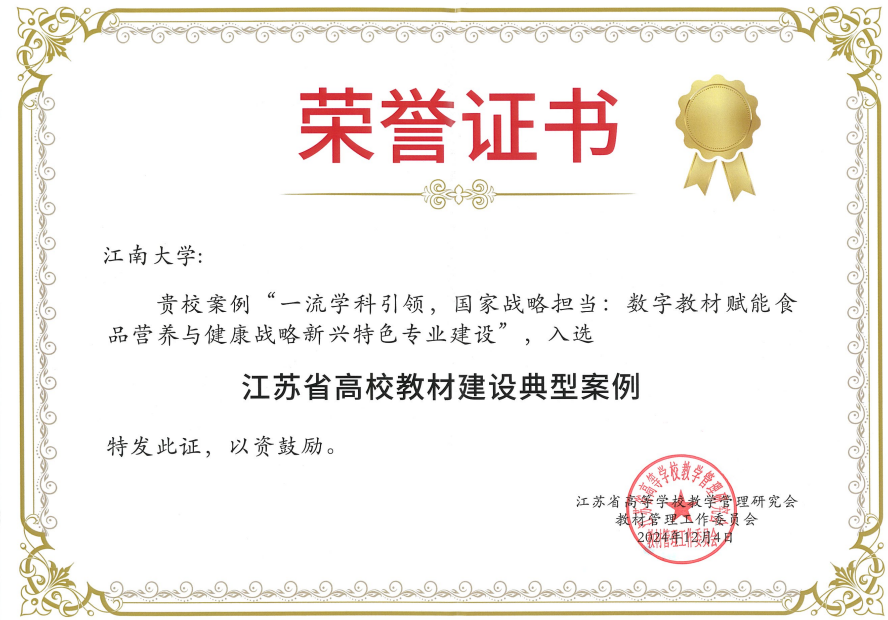 为深入学习领会习近平总书记关于教材工作的重要指示精神,紧扣用习近平新时代中国特色社会主义思想铸魂育人主题主线,贯彻落实首届全国教材工作会议精神,发挥教材建设人才培养的引领支撑作用,12月4日至6日,江苏省高等学校教学管理研究会教材管理工作委员会2024年学术年会在苏州召开。会议主题是建设规划教材,支撑人才自主培养。会上表彰2024年省高校教材建设典型案例,我校食品学院申报的《一流学科引领,国家战略担当:数字教材赋能食品营养与健康战略新兴特色专业建设》成功入选。