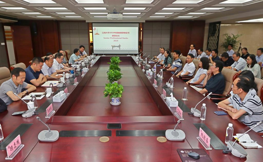 6月28日上午,江南大学2019年度教授证书颁授仪式在行政楼B305会议室隆重举行。校党委书记朱庆葆、校长陈坚以及组织部、党委教师工作部、人事处、教务处、研究生院、科研院、产研院、社科处等职能部门负责人和全体新晋教授出席。颁授仪式由副校长顾正彪主持。
