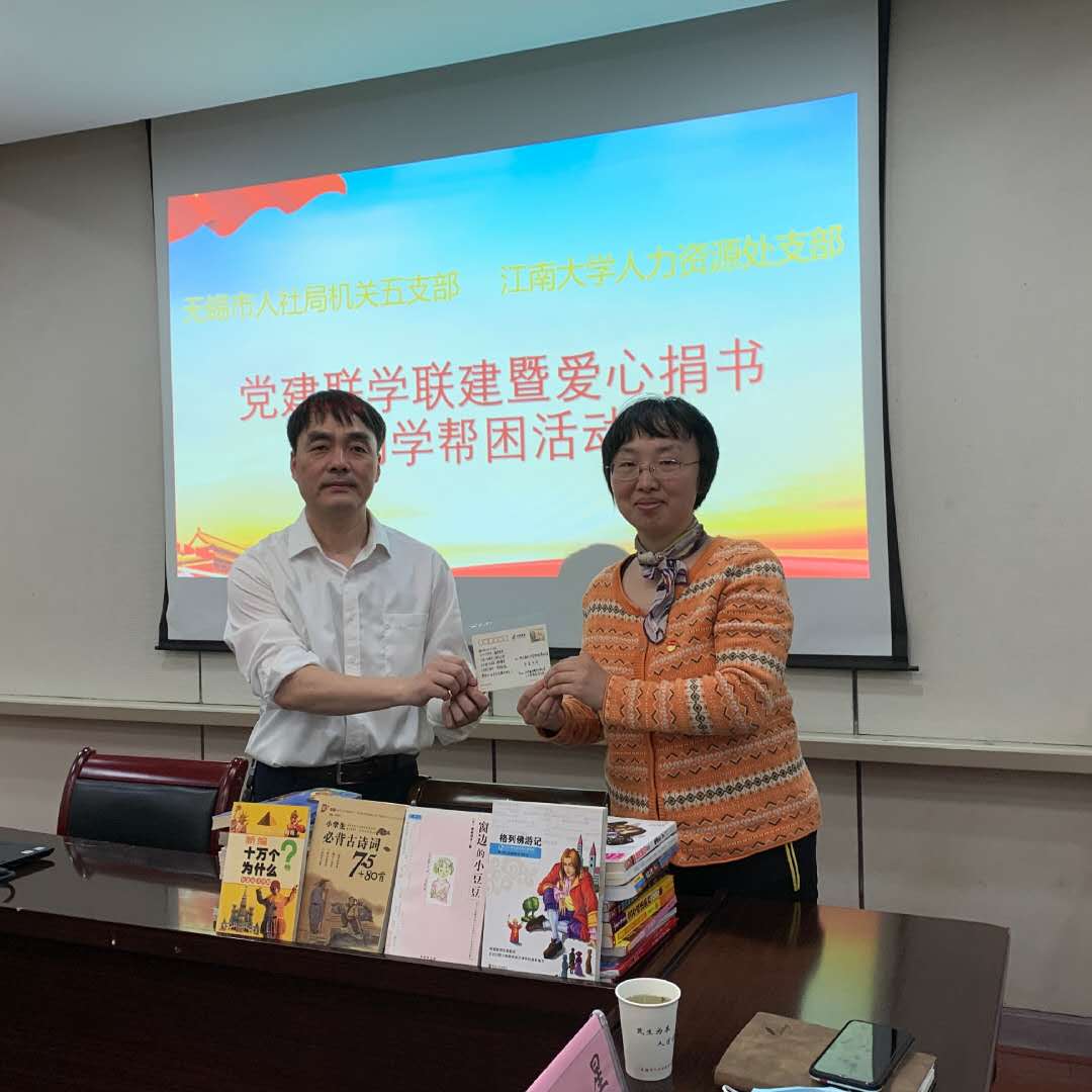 2020年5月14日下午,机关党委人力资源处支部与无锡市人社局机关五支部在无锡市人社局会议室开展了结对共建暨捐书助困活动,人力资源处处长王鸿博、无锡市人社局副局长(挂职)陆秦和双方支部成员参加了本次活动。