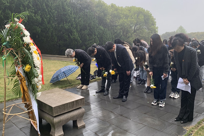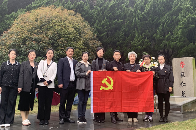 古木青松,苍翠肃穆,4月1日下午,教育发展基金会、社会资源处党支部全体党员、外国语学院师生代表一行40余人前往马山华侨公墓祭扫原国家副主席荣毅仁及其夫人杨鉴清墓地。