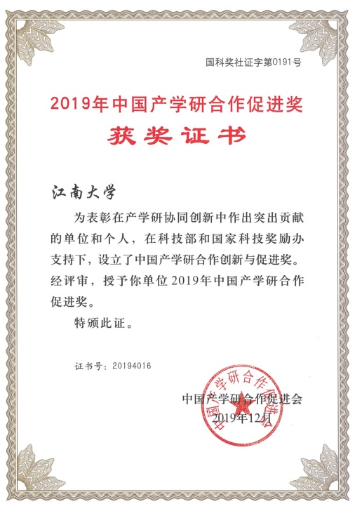 会议表彰了2019年在产学研合作、成果转化、军民协同、工匠精神等方面作出贡献的先进单位和个人,颁发“中国产学研合作创新与促进奖”。我校荣获2019年中国产学研合作促进奖,我校合作申报项目“黄酒品质提升关键技术研究及应用”“基于1M2W技术的智能安全服装创新研究与产业化”分获“产学研合作创新成果奖”二等奖和优秀奖。