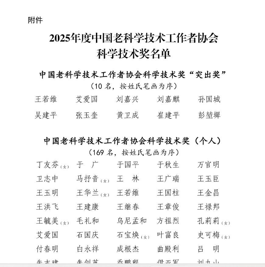 2025年度中国老科学技术工作者协会科学技术奖名单