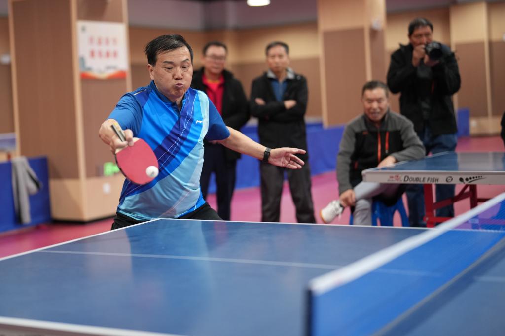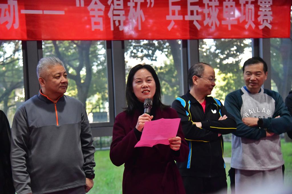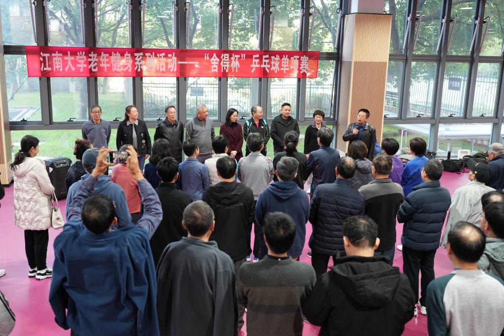 陈祎在致辞中对本次赛事的顺利召开表示祝贺。她讲到这次比赛汇聚了广大中老年乒乓球爱好者,不仅是一场切磋球技的比赛,还是一个增进健康、传承友谊的平台,更是展示江南人坚韧顽强品格的舞台。她希望通过比赛,丰富中老年教职工的精神文化生活,激发积极向上的精神风貌,提升大家的幸福感和满足感。本次比赛以个人名义参赛,男同志55-62周岁为甲组,63-75周岁为乙组;女同志52-70周岁为一组。比赛第一阶段为小组循环赛,第二阶段进行交叉淘汰赛,最后决出名次。各参赛运动员在场上比赛时都能集中精力打好每一个球,体现良好的精神面貌;在观看其他队员比赛时,为场上队员每一个精彩的对决欢呼;比赛间隙,参赛队员们不分年龄、单位,愉快交流打球经验、分享人生各种感悟,友情得以升华。
