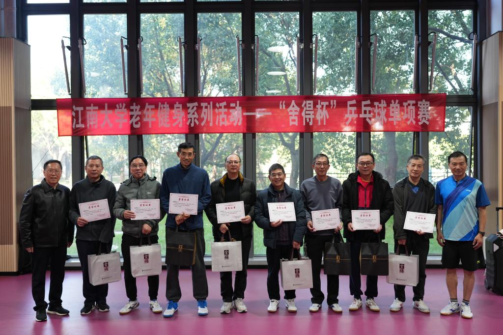 11月30日上午,江南大学老年人体育协会在学校新建的训练馆乒乓室举行了首届“舍得杯”乒乓球单项赛,江南大学原副校长徐岩教授、附属医院许德金医生等50名乒乓球爱好者踊跃报名参加了这次比赛。江南大学原副校长姜忠平作为现任老年人体育协会会长参加了开幕式。离退休党工委副书记、离退休处副处长陈祎致开幕词。舍得酒业集团华东地区总经理周广勇讲话表示祝贺。吴锡生教授代表全体运动员宣誓,龚宁裁判长代表全体裁判员进行了宣誓。舍得酒业集团首席科学家徐岩教授宣布比赛开始。开幕式由老体协副秘书长谢翠林主持。