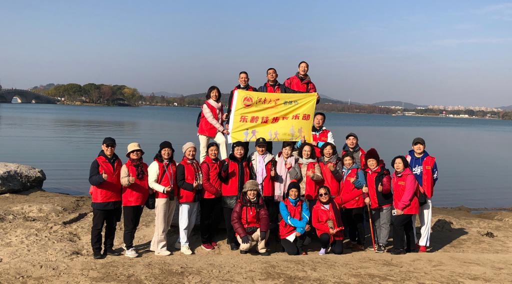 2025年第一天,我校46位老同志汇聚在渤公岛生态公园,穿上活动专用红马甲,融入活动现场欢乐的海洋。健步走开始,大家兴高采烈,挥动着江大老体协乐龄徒步俱乐部的旗帜,和无锡市上千名参与者一起欢乐同行,沿着最美太湖岸线蠡湖健步行进5.6公里,共同以脚步丈量城市之美,用健康向上的姿态喜迎新年。大家纷纷停下脚步,用手机记录下沿途的风景和伙伴们的笑脸,传递新年的喜悦,互道新年祝福,并合影留念。健步走活动后,许多老同志还参与了无锡电视台《阿福聊斋》节目主持人和市民朋友的现场互动、问答、抽奖,我校2位老同志也喜获大奖。