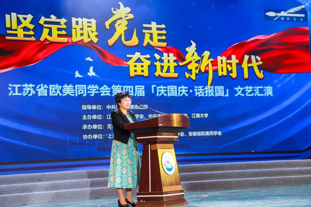 朱庆葆代表学校师生向长期关心和支持江南大学发展的各级领导、各界朋友,致以衷心的感谢。他指出,全省归国留学人员通过文艺汇演的方式,共同为伟大祖国庆贺,共同为伟大时代欢呼,共同为伟大事业点赞。希望我校欧美同学会进一步发挥桥梁纽带作用,凝聚广大归国留学人员,汇合智慧和力量,挥洒青春和汗水,凝心聚力奋进新征程,齐心协力构筑新优势,用“建功新时代、共圆中国梦”的实际行动,向祖国献礼、为祖国添彩。