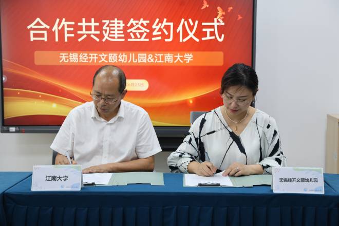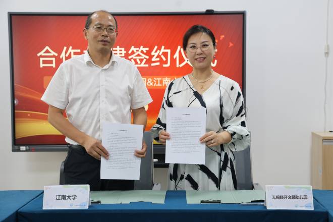 6月23日,江南大学工会与无锡经开文颐幼儿园在无锡经开文颐幼儿园会议室举行合作共建签约仪式,江南大学工会副主席刘伯贤、文颐幼儿园园长杜丹娴及双方教职工代表出席活动。