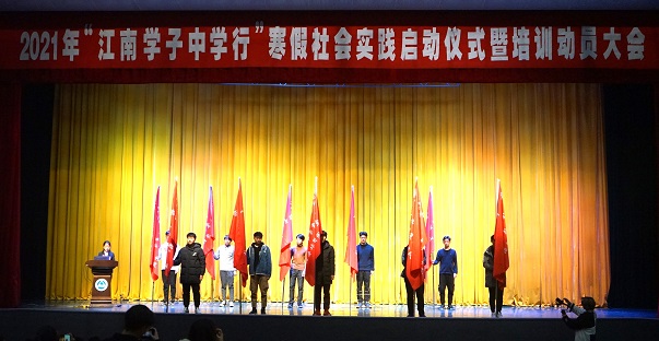 随后举行2021年“江南学子中学行”招生宣传寒假社会实践授旗启动仪式,陆敏芝、单云婷为大区团队代表授予中学行实践团队旗帜,单云婷宣布2021年“江南学子中学行”招生宣传寒假社会实践正式启动。大会现场播放往年中学行回顾视频,“情系母校,鼋梦江南,我们在江南大学等你!”嘹亮的口号响彻会场,展现和寄托了江南人对高考学子的殷切祝福和希冀。