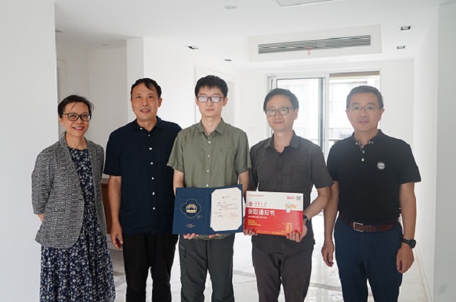7月24日下午,江南大学副校长张影陆,招生就业处处长赵建新,人工智能与计算机学院院长刘渊,设计学院副院长曹鸣,商学院党委副书记、副院长徐静一行,为我校三位教职工子女亲送由陈卫校长亲笔签发的2021级本科新生录取通知书。